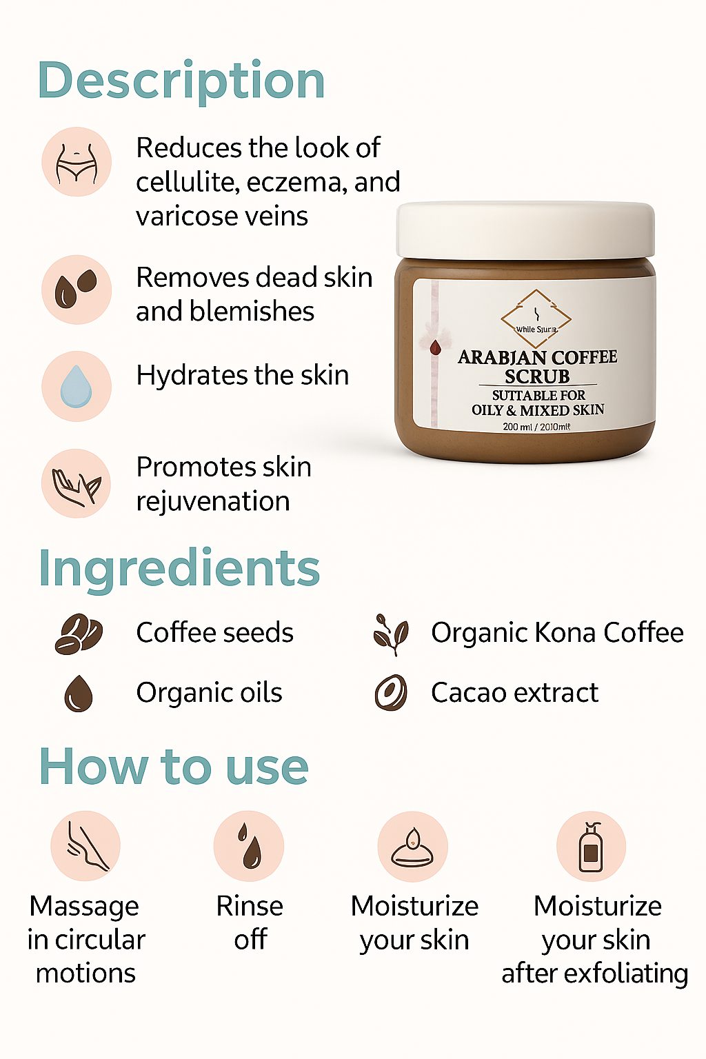 مقشر قهوة أرابيكا نقي - مقشر طبيعي للجسم للعناية بالبشرة، وعلامات التمدد، وحب الشباب، والسيلوليت، يُخفف من ظهور الأوردة العنكبوتية، والأكزيما، وبقع التقدم في السن، والدوالي. استمتع برائحة القهوة المنعشة! مقشر قهوة إس جيه النقي طبيعي ومصمم خصيصًا لاستهداف السيلوليت، وعلامات التمدد، وحب الشباب، والأكزيما بفعالية، بفضل الكافيين المستخلص من أجود أنواع حبوب أرابيكا؛ ممزوج بزيوت وأملاح مرطبة ومجددة ومقشرة، بالإضافة إلى السكر البني، لبشرة مشدودة.