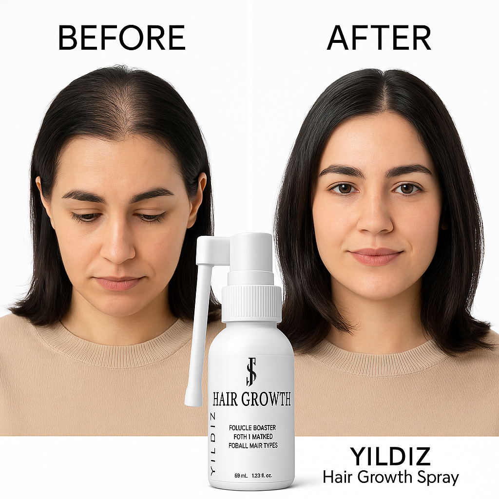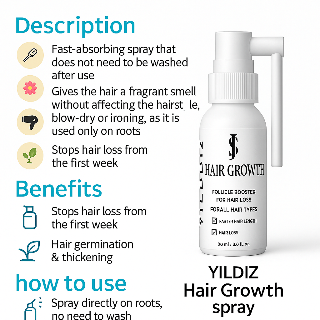 بخاخ يلدز سريع الامتصاص لا يحتاج للغسل بعد الاستخدام ويعطي الشعر رائحة عطرة دون التأثير على تسريحة الشعر أو السشوار الأسود أو المكواة حيث يستخدم على الجذور فقط وغير دهني يوقف تساقط الشعر من الأسبوع الأول سيروم لانبات الشعر وتكثيفه مما يؤدي إلى طول أسرع للشعر بمعدل تقريبي 3 سم خلال شهرين