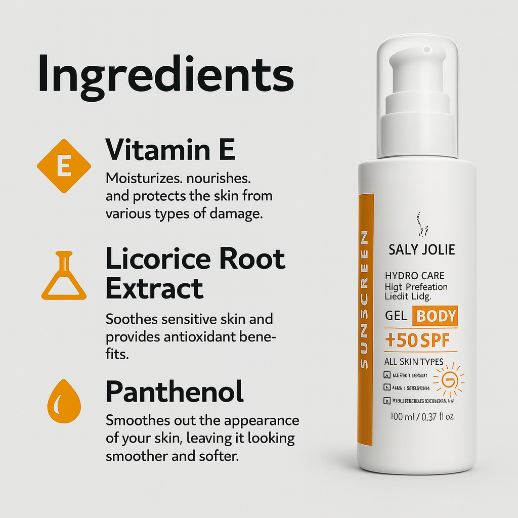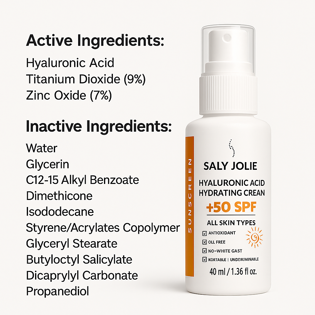 Protect and hydrate your skin daily with Saly Jolie Hyaluronic Acid Hydrating Face Cream SPF 50. This lightweight, fast-absorbing formula combines deep hydration with powerful sun protection against UVA/UVB rays. Infused with Hyaluronic Acid and Niacinamide, it leaves your skin smooth, radiant, and protected without greasy residue or white cast. Suitable for all skin types.100% Sunscreen SPF 50